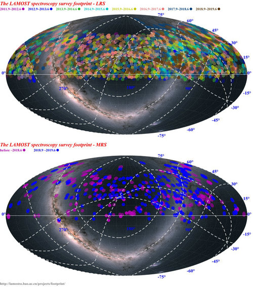 Fig. Top: Footprint of the LAMOST pilot survey and the seven-year regular low-resolution survey. Bottom: Footprint of the LAMOST medium-resolution commissioning and the first-year regular medium-resolution survey. (Image by LAMOST)