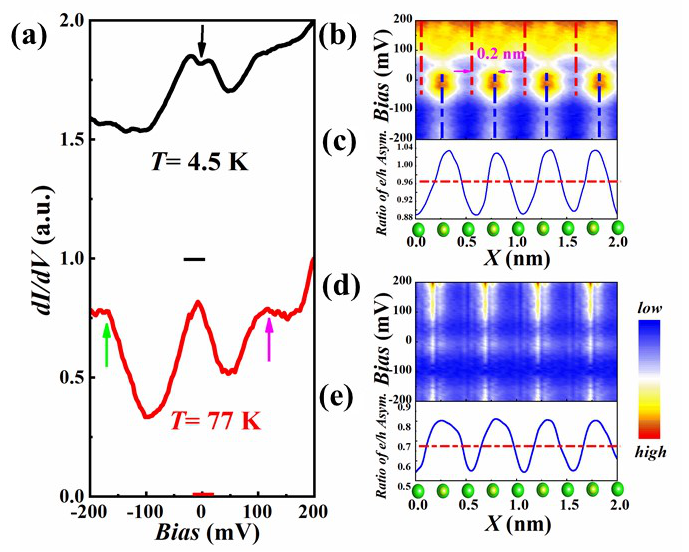 (a) The STS line-cut map along the Zr-Se-Zr direction at T = 4.5 and 77 K, respectively. (c),(e) The calculated ratio of e/h asymmetry based on the spectra measurement in (b) and (d), respectively. (Image by LUO Xuan)