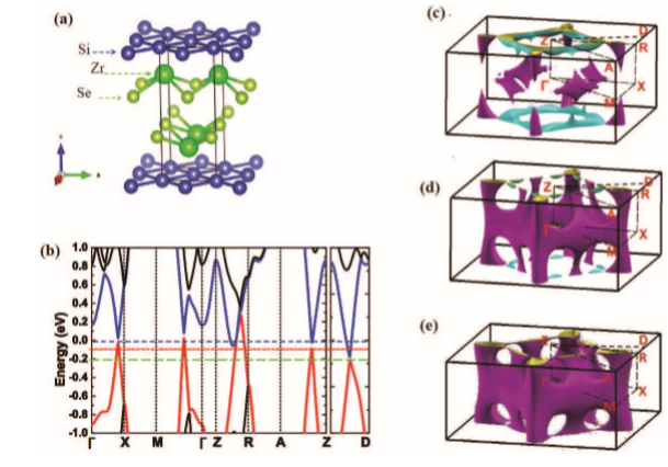 (a) Crystal structure of ZrSiSe. (b) The first-principles calculated band structure of ZrSiSe with SOC along high symmetry lines. The dashed blue line, dotted red and long dashed green lines label three different Fermi levels corresponding to the cases with temperature T=5 K (intrinsic case), 102 and 106 K according to Fig. 2(e), respectively. (c),(d),(e) The three-dimensional Fermi surface with the Fermi energy labeled by the dashed blue, dotted red, and long dashed green lines in (b), respectively. (Image by LUO Xuan)