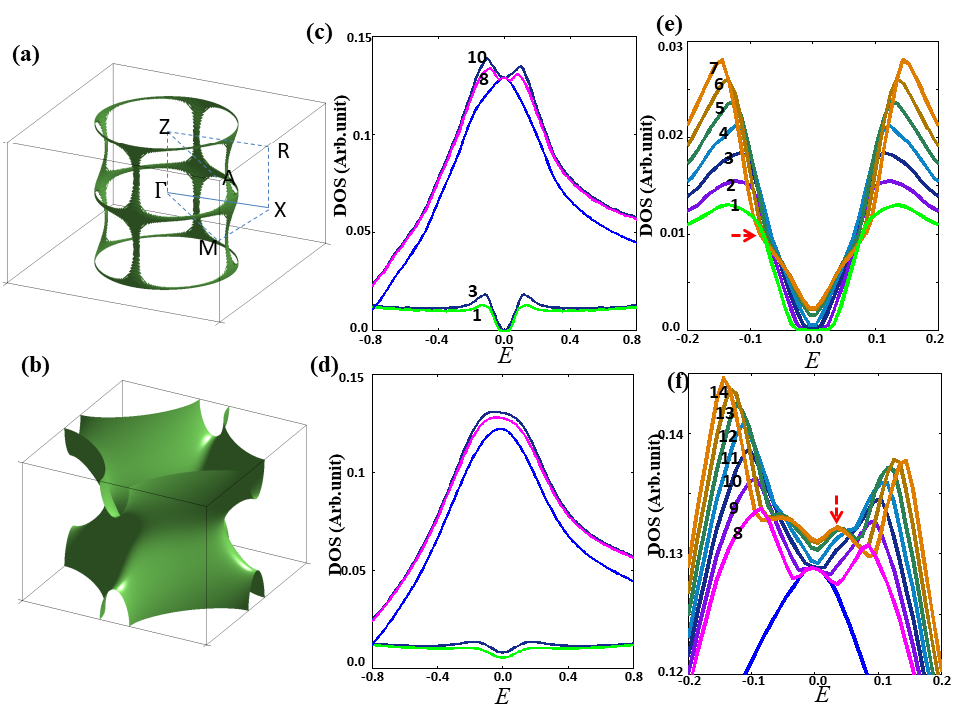(a),(b) The calculated Dirac nodal-line structure and Fermi surface of trivial quadratic band with the model in the Supplemental Material, respectively. (c),(d) The calculated DOS with the model in Supplemental Material for kBT = 0.004 (T = 4.5 K) in (c) and kBT = 0.05 (T = 77 K) in (d). Bottom curves 1 and 3 are from Dirac nodal-line bands in (a) with (λsoc, Δex)=(0.06, 0) and (0.06, 0.02), respectively. Top curve 8 and 10 are from the sum of blue curve and bottom curves 1 and 3, respectively. (e) and (f) The enlargement of the bottom and top parts of (c), respectively. Curves 1 and 3 in (e) and (f) are same to these in (c). The curves 2, 4–7 with (λsoc, Δex)= (0.06, 0.01), (0.06, 0.03–0.06). The curves 9, 11–14 have the same values as the curves 2, 4–7. In (a)–(f), other parameters are present in the Supplemental Material. (Image by LUO Xuan)