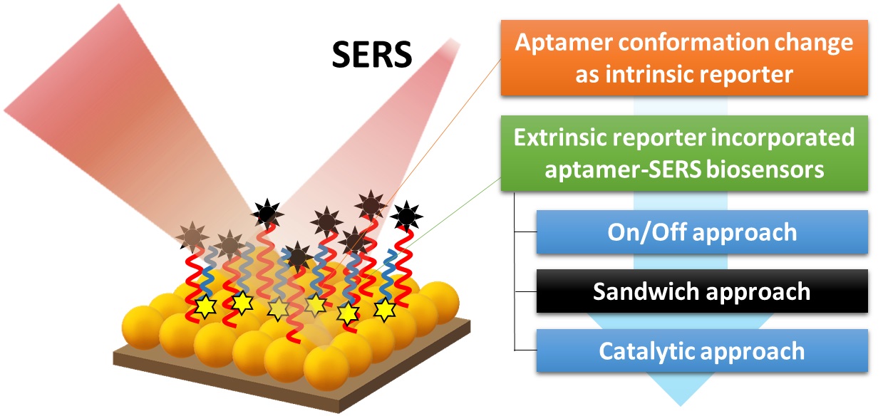 They also categorized the aptamer-SERS biosensors into two categories in a review article for better understanding, in which label-free biosensors based on intrinsic conformation change of aptamer, and Raman reporter labeled aptamer-SERS biosensors were listed. The latter were further divided into three sub-types basing on "on/off approach", "sandwich" approach, and catalytic approach. It showed the schematic diagrams with extensive examples to elaborate the working strategies and analytical applications.