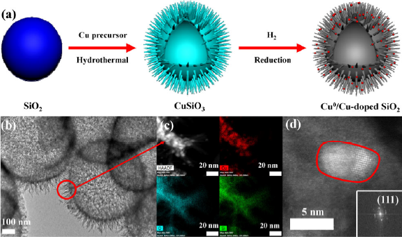 Fig. 1. (a) Synthesis scheme, (b-d) Morphology of Cu0/Cu-doped SiO2 catalysts (Image by CHENG Chun)
