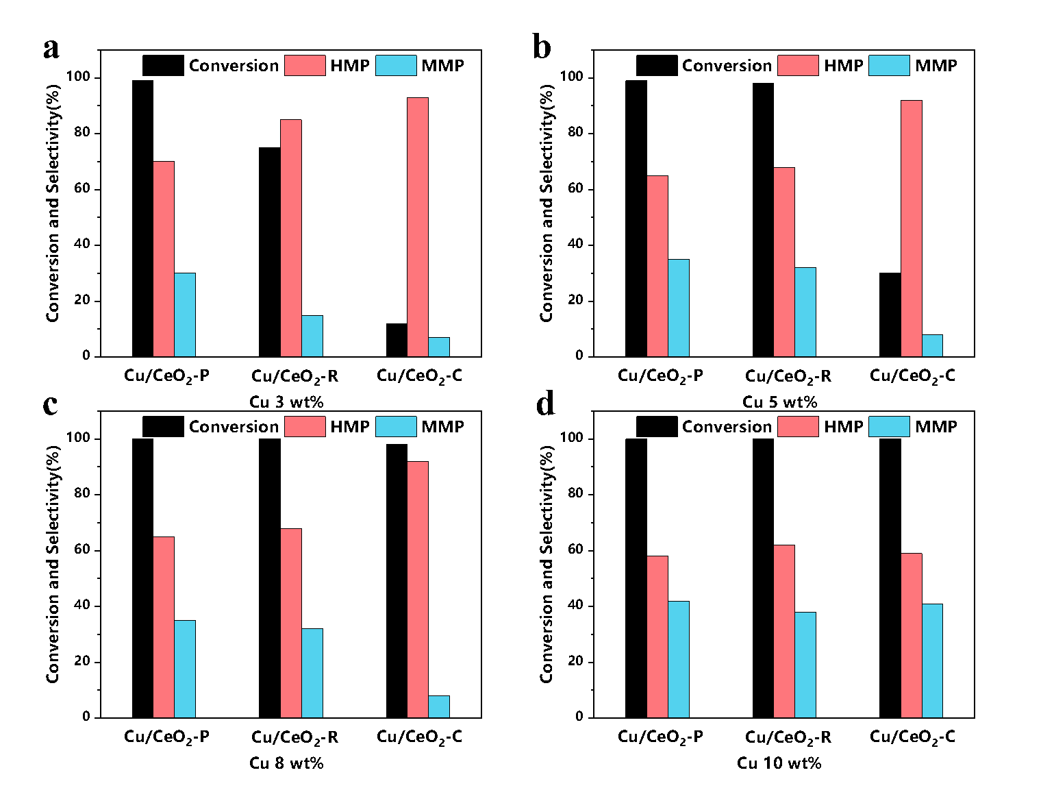 Results showed that Cu/CeO2-P (copper loaded on nano-polyhedral CeO2 with (1 1 1) terminated surface) has the best performance, it could achieve the complete conversion of vanillin at 130 ℃, while Cu/CeO2-R (Cu loaded on nano-rod CeO2 with (1 1 0) plane) and Cu/CeO2-C (Cu loaded on nano-cube CeO2 with (1 0 0) facet) can convert 50% and 10% vanillin respectively under the same conditions. This difference is due to the weakest SMSI effect between (111) crystal surface exposed by CeO2-P and Cu so that Cu on the surface is easier to be reduced to Cu0 with high activity.