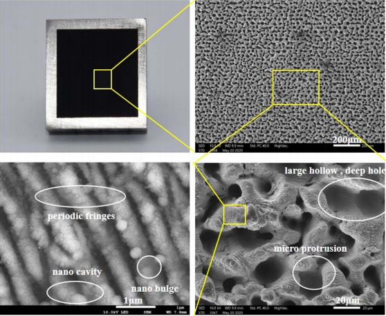 The blackened sample fabricated by the circularly polarized laser and its morphology. (Image by XIOPM)
