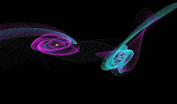 Screenshot of a simulation of the interaction between flyby stars and protoplanetary disks. (Image from https://www.physics.utah.edu)