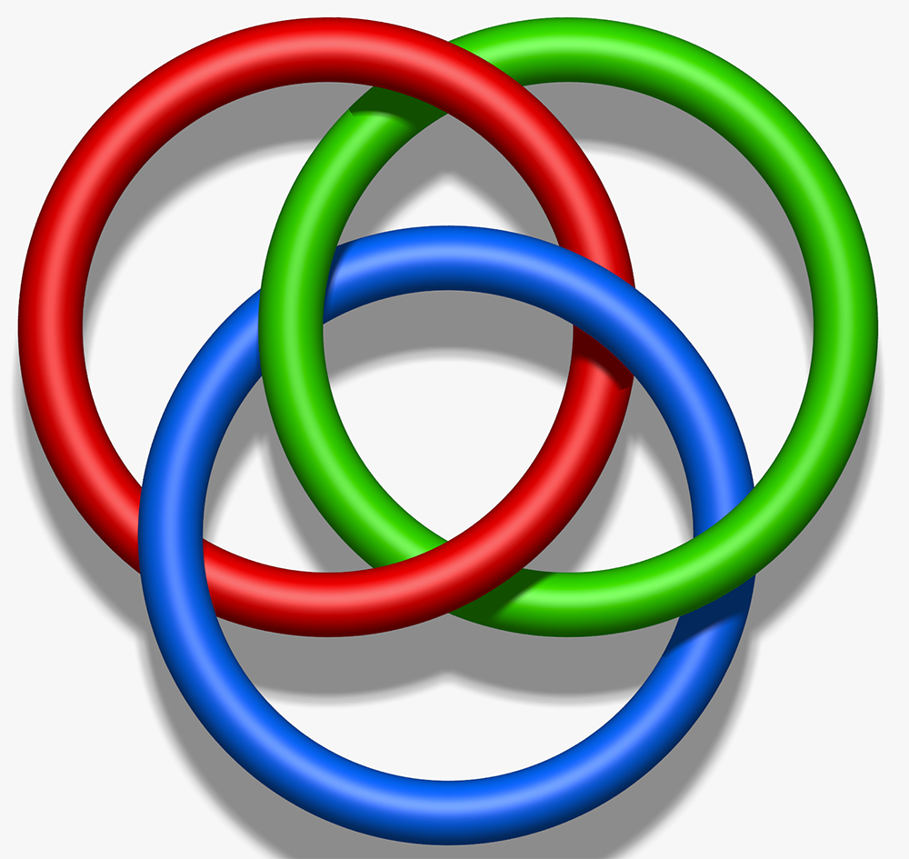 Fig.1. Borromean ring: only three rings can be linked together while any two of them are unlinked. (Image by IOP)