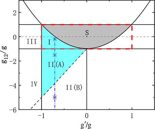 Fig. 2. Mean-field stability diagram of three-component bosons. The gray area is the stable region, which is smaller than the stable region of two-component ones (surrounded by red dashed lines). (Image by IOP)