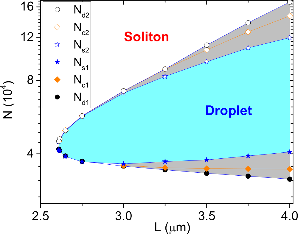 Fig. 5. a. Illustration of confinement-induced bound effect: when increase the particle number or reduce the trap length, the droplet can become unstable when its size is comparable to the trap length. b. hase diagram in the parameter plane of particle number and trap length. The blue and white areas marks, respectively, the droplet and soliton regions, and the gray area is the region when these two states can coexist with each other. (Image by IOP)