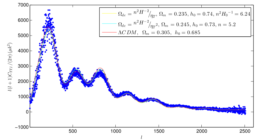Blue dots represent Planck 2018 CMB TT angular power spectra. The red, yell-ow, and cyan lines are the CMB theoretical values of angular power spectra from ΛCDM, Model I, and Model II, respectively. (Image by XAO)