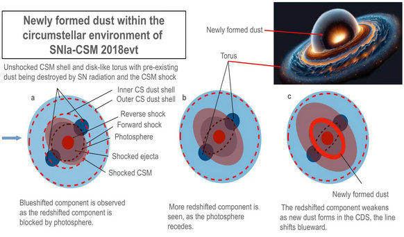 Fig.1: Schematic sketches of SN 2018evt at the different phases a, b, and c. The artwork at the top right presents the dust formation process produced by ChatGPT.