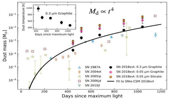 Fig. 2: Temporal evolution of the mass of the newly-formed dust in SNIa-CSM 2018evt with different compositions, together with the dust masses estimated for core-collapse supernovae. The black line presents the power law fit to the mass of the newly formed dust of SN 2018evt for 0.3 um graphite grains. (Image by the National Astronomical Observatories of the Chinese Academy of Sciences)