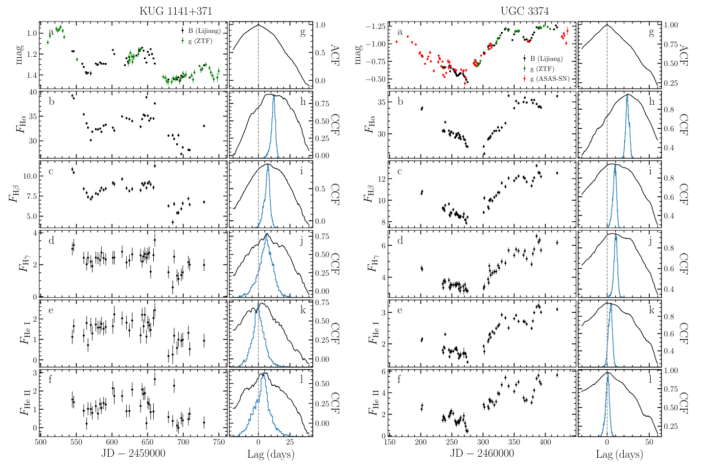 Figure 1: Light curves and CCF results for KUG 1141+371 (left) and UGC 3374 (right). Subplots (a)-(f) show the light curves for photometry, Hα, Hβ, Hγ, He I, and He II emission lines. Subplot (g) presents the ACF results of the photometric light curve. Panels (h)-(l) display the CCF results (black line) and the CCCD (blue line) between the emission lines and photometric light curve. (Image by FENG)