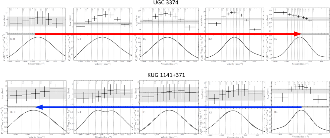 Figure 2: Velocity-resolved time delays for KUG 1141+371 (left) and UGC 3374 (right). Each subplot presents the results for the Hα, Hβ, Hγ, He I, and He II emission lines, divided into two panels. The upper panels show the time delay for each velocity bin, with the horizontal dashed lines indicating the mean delay for each emission line and the gray shaded regions representing the corresponding uncertainties. The vertical gray dashed lines mark the boundaries of each velocity bin. In the lower panels, the black stepped lines depict the RMS spectra generated from the broad emission line profiles, with the vertical gray dashed lines again marking the boundaries of each velocity bin. (Image by FENG)
