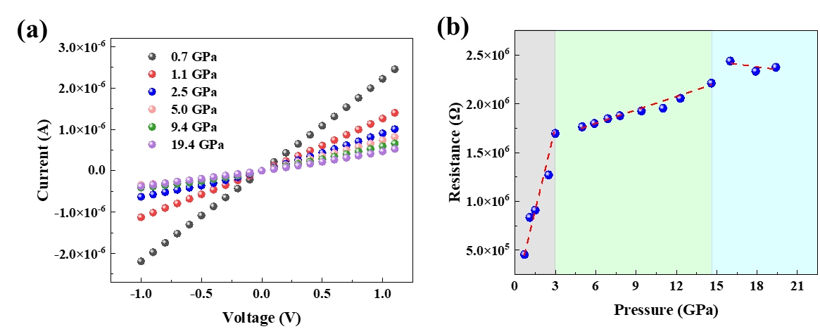 (a) Representative I-V curves of 5% Y-doped HfO2. (b) The pressure dependence of the resistance. (Image by PAN Xiaomei)
