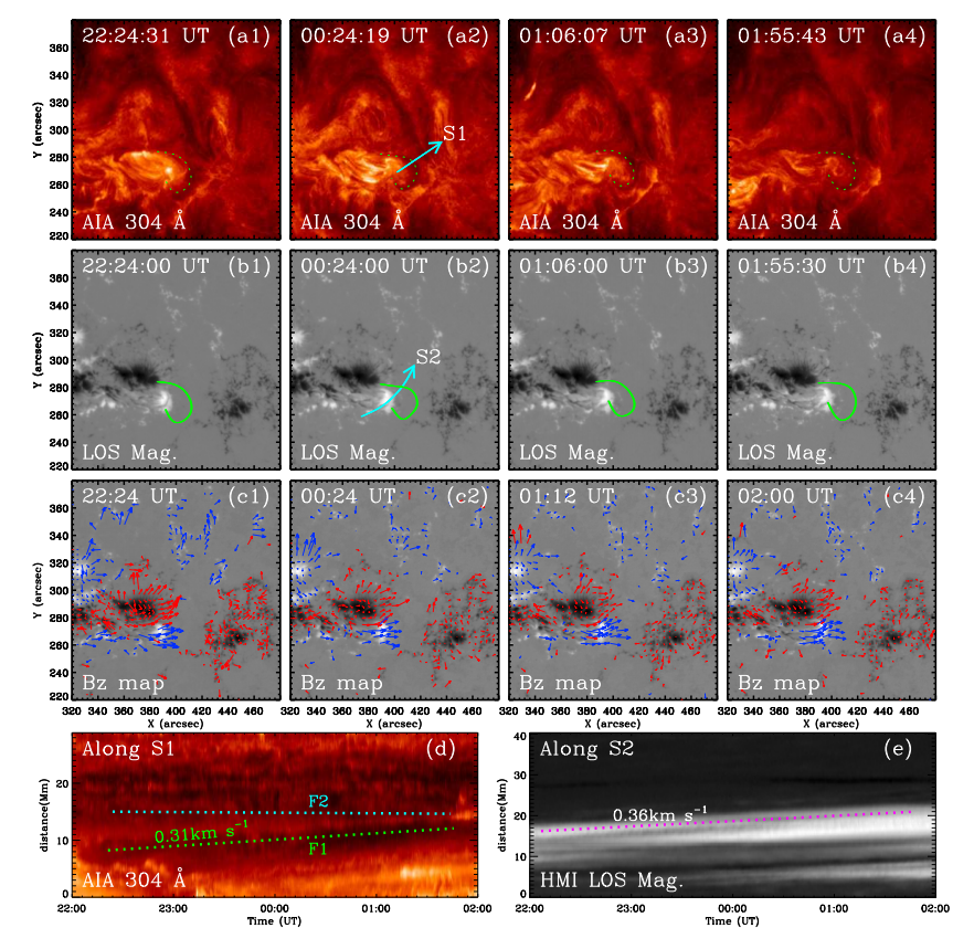 Figure 1: the motion of filament F1 and the evolution of the photospheric magnetic field. Panels (d) and (e) display time-distance diagrams along slices S1 and S2, respectively. The green lines in panels (a1) to (b4) mark the positions of filament F1. The transverse magnetic field (panels c1-c4) is represented by blue (red) arrows superimposed on positive (negative) polarity regions of the longitudinal magnetic field. (Image by WU Zongyin)
