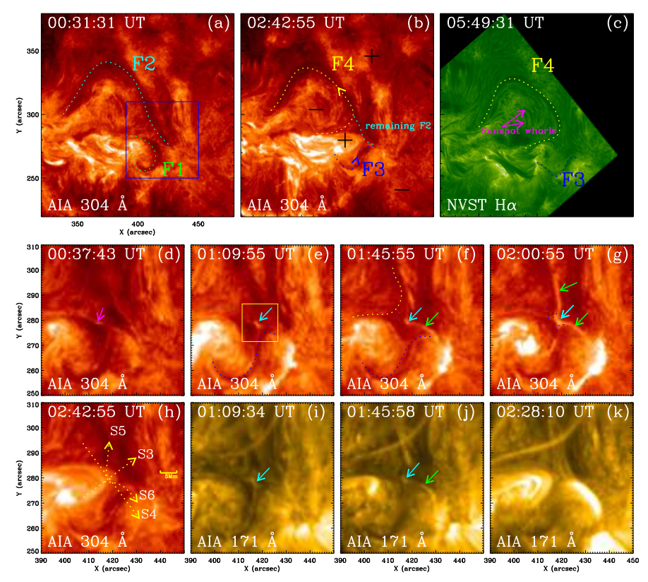 Figure 2: the interaction process between filaments and the observational signatures of magnetic reconnection. In panel (b), the axial magnetic field directions of filaments F3 and F4 are represented by blue and yellow arrows, respectively. In panel (d), purple arrows indicate plasmoids, cyan arrows mark the current sheet, and green arrows denote outflows. (Image by WU Zongyin)