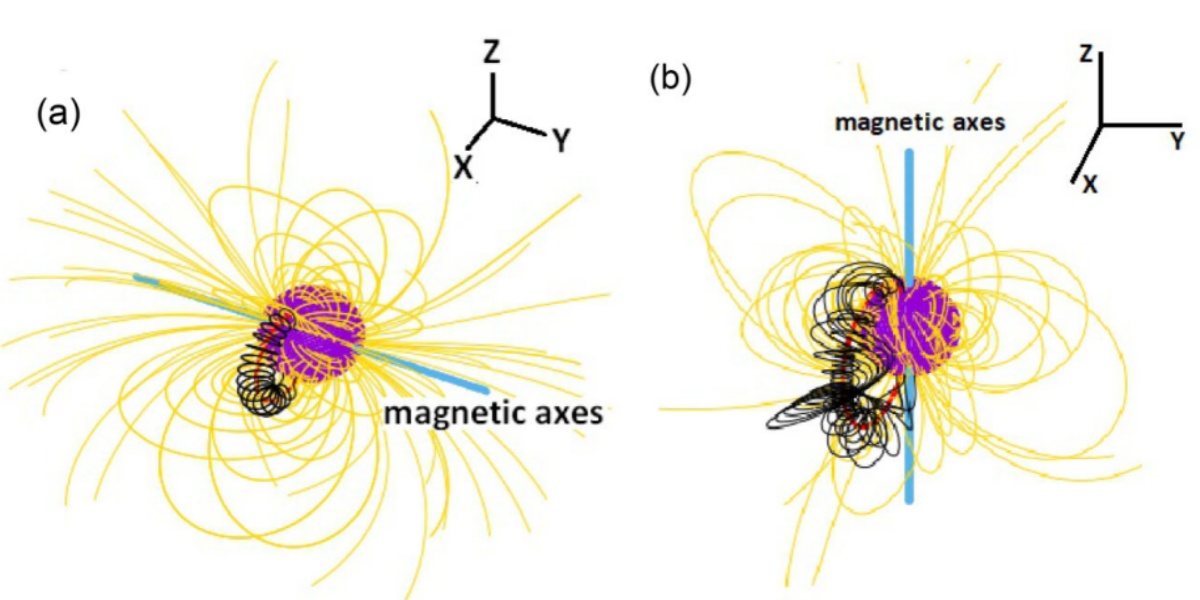 When a magnetic flux rope is present, the distribution of the magnetic field near the star's surface. The purple sphere represents the star, the blue line represents the magnetic axis, the red line represents the magnetic flux rope, the yellow lines represent the magnetic field lines, and the black lines represent the magnetic field lines near the rope. The left and right figures show the two cases where the magnetic flux rope is perpendicular and parallel to the magnetic axis, respectively. (Image by MENG Ying)