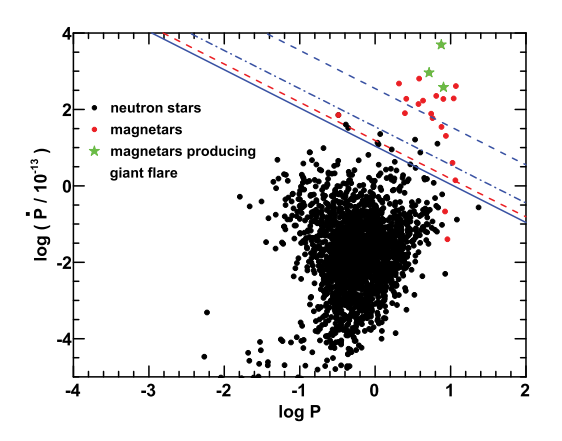 The distribution of neutron star periods and period derivatives. Black dots represent ordinary neutron stars, red dots represent magnetars, and green stars denote magnetars that have been observed to produce flares. The three blue lines show theoretical criteria for different ejected masses (solid, dash-dotted, and dashed lines correspond to 1024.5 g, 1025 g, and 1026 g, respectively). Flares can only occur when a neutron star's parameters lie above these lines. (Image by MENG Ying)