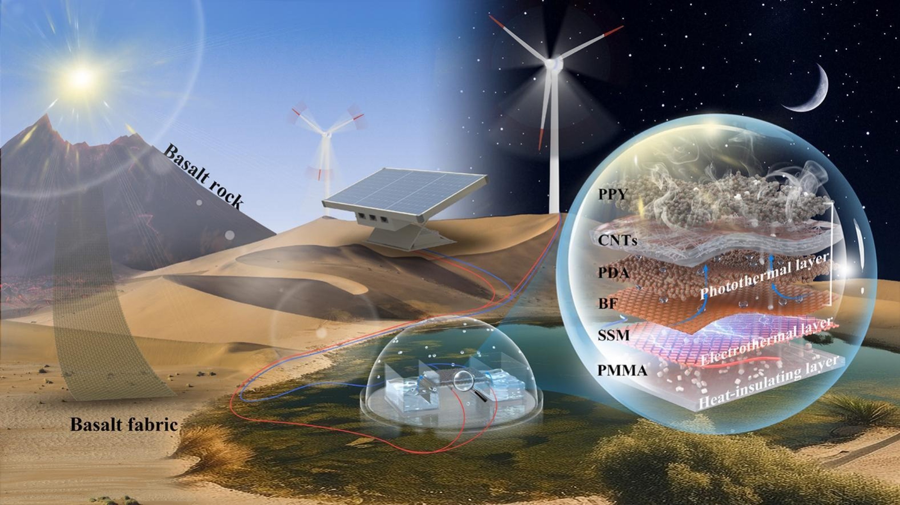 Led by Prof. Abudukeremu Kadier and Prof. MA Pengcheng, the team created a basalt fabric-based photothermal interfacial PPY-CNTs-PDA@BF evaporator and integrated with an SSM 304 electrothermal layer. This design allows it for all-weather efficient brackish water desalination.