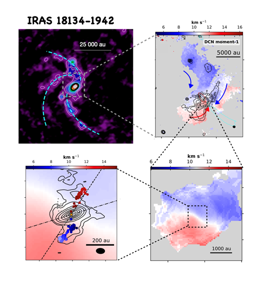The researchers made their multiscale, high-resolution observations in the massive star-forming region IRAS 18134-1942, located about 1.25 kiloparsecs from the Sun. Their results reveal a striking layered system of gas flows: At the largest scales, multiple spiral-like streams channel material inward, shaped by the rotation and collapse of the parent cloud. These streams converge into an elongated, bar-like structure that funnels gas further toward the center. Closer in, the gas forms a rotating, collapsing envelope, and finally, within a few hundred AU, settles into an accretion disk exhibiting Keplerian rotation. This entire progression resembles a miniature barred spiral galaxy embedded within a molecular cloud.