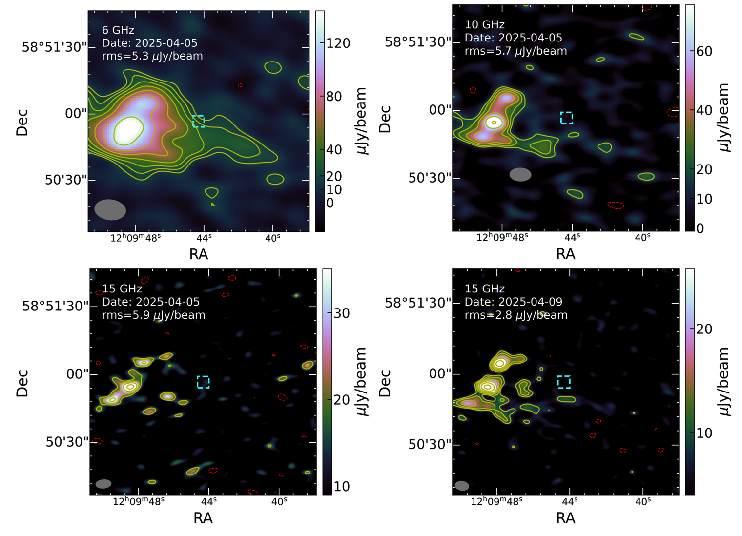 Very Large Array (VLA) images show that no persistent radio source was detected at the position of FRB 20250316A across different frequency bands and observation periods. (Image by AN Tao)