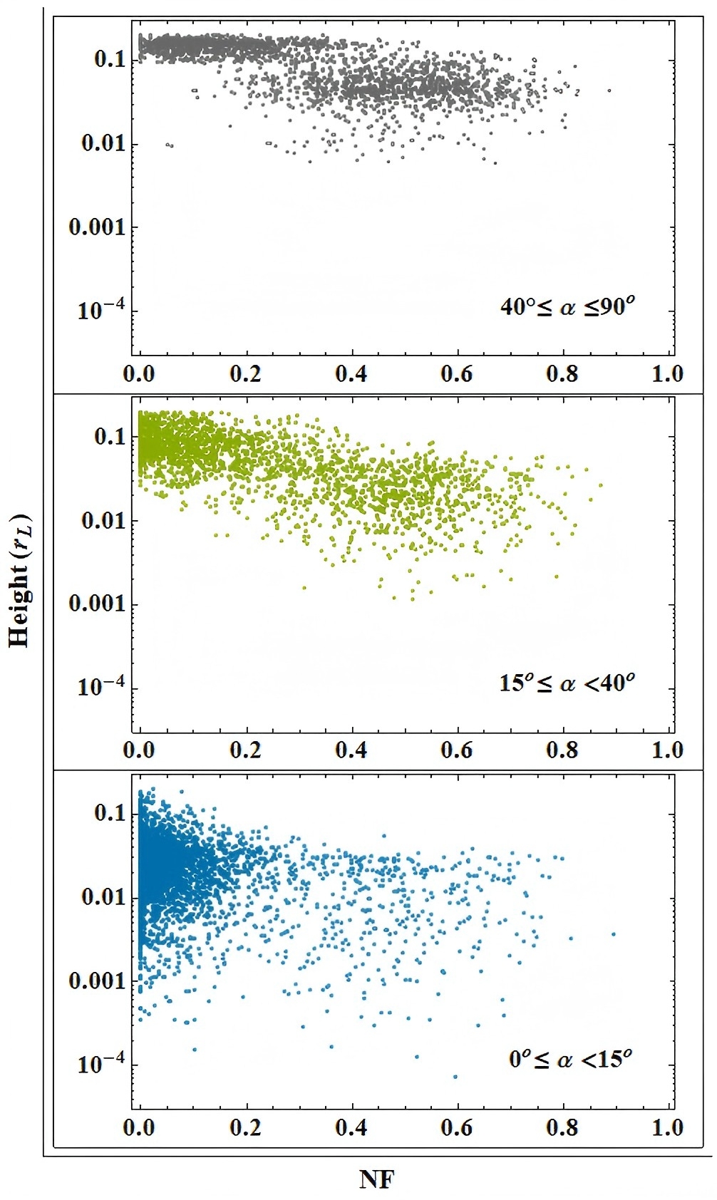 Scatter plots showing the distribution of nulling fraction (NF) as a function of height (rL) for three different ranges of obliquity angles. Each plot is shown on the same log-linear scale. (Image by XAO)