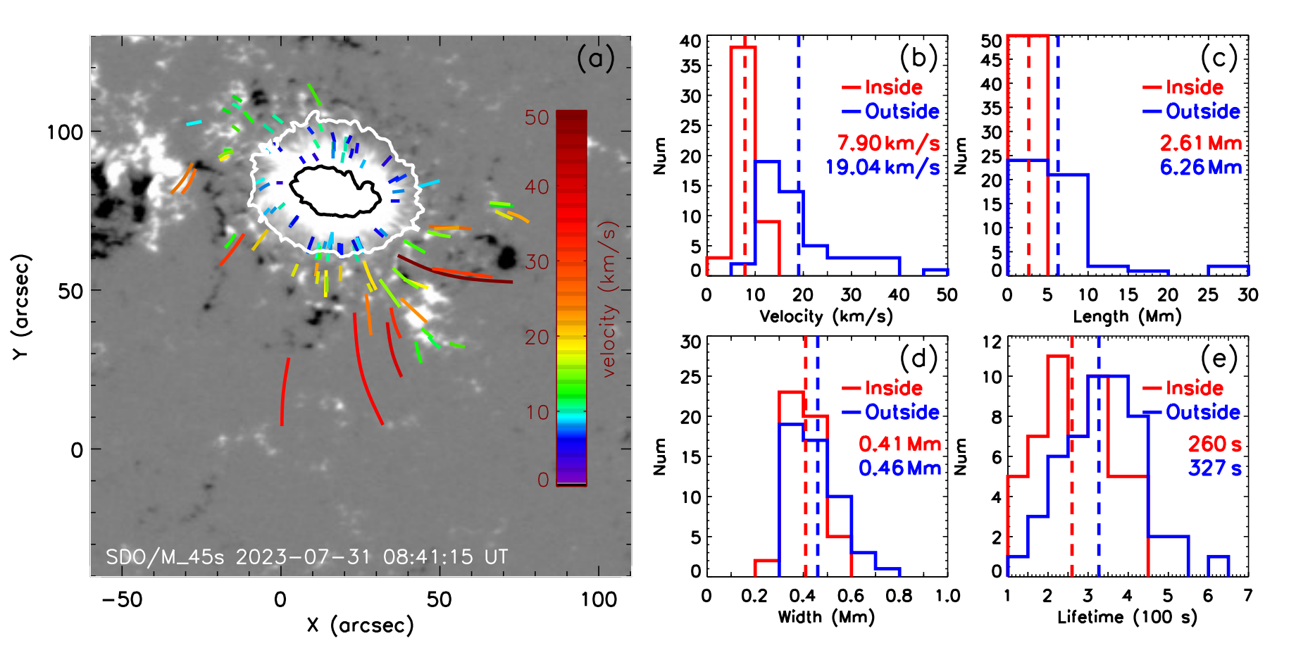 Figure 1. (a) Distribution of the sunspot and the jets analyzed in this study. The umbra is marked in black and the penumbra in white. The colors of the jets indicate the projected velocities. (b)–(e) Histograms comparing the velocity, length, width, and lifetime of the jets. Inside jets are shown in red, while outside jets are shown in blue. The dashed lines mark the mean values of each group. (Image by WU Guotang)