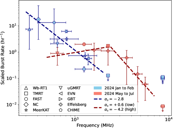 Burst rate of FRB 20240114A as a function of observing frequency during 2024 January‑February (blue) and May‑July (red). All observations from different telescopes have been scaled to TMRT's detection threshold, showing a clear change in the frequency‑dependence of the source's burst rate between the two periods. (Image by SHAO)