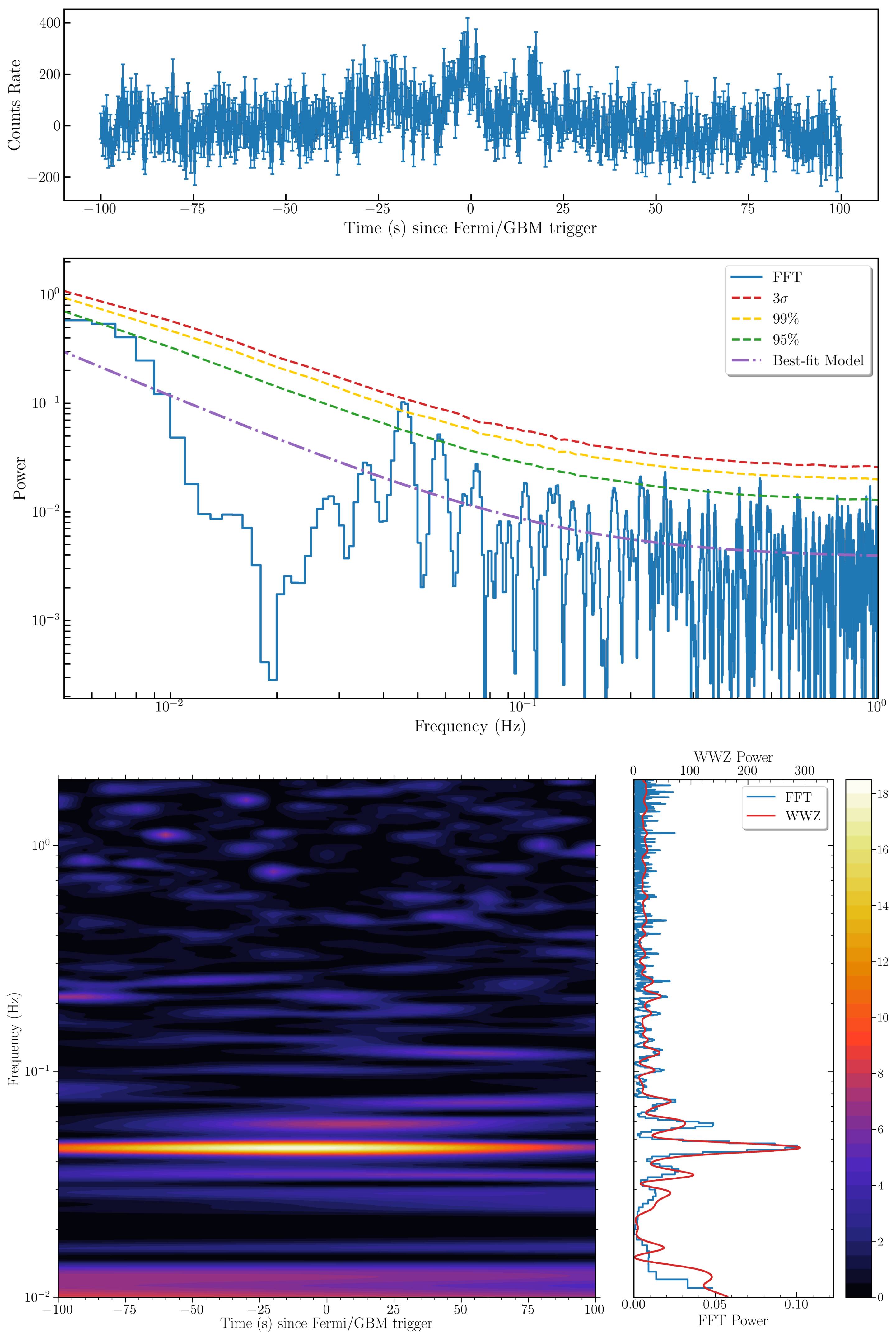 The light curve of the third trigger (GRB 250702E) along with its FFT and WWZ power spectra. (Image by SONG Feifan)