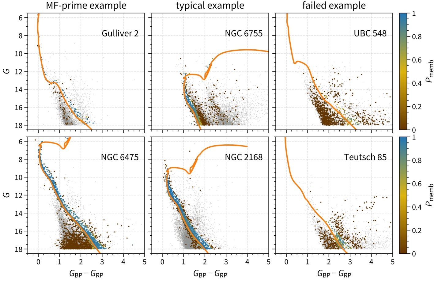 Figure 2. Performance of the MiMO method on clusters with varying data quality. The left panel shows a "MF Prime" cluster (Gulliver 2) with a well-defined main sequence, allowing for reliable mass function determination. The orange line represents the best-fit isochrone derived by MiMO. (Image by SHAO)