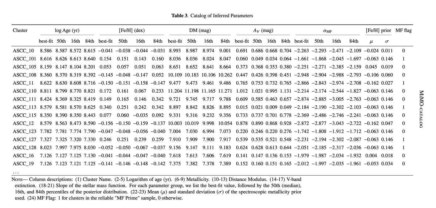 Figure 3. A snapshot of the MiMO catalog. The table lists homogeneous physical parameters—including age, metallicity, distance modulus, extinction, and mass function slopes—for 1,232 open clusters. (Image by SHAO)