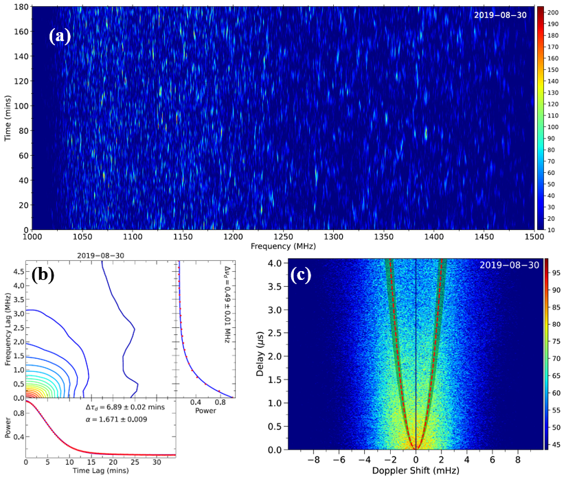 Using autocorrelation function analysis and secondary spectrum techniques, the researchers precisely measured key scintillation parameters. The average scintillation timescale was determined to be 7.67 minutes, with a decorrelation bandwidth of approximately 0.56 MHz. The study notably captured persistent parabolic scintillation arcs across all observational frequencies.
