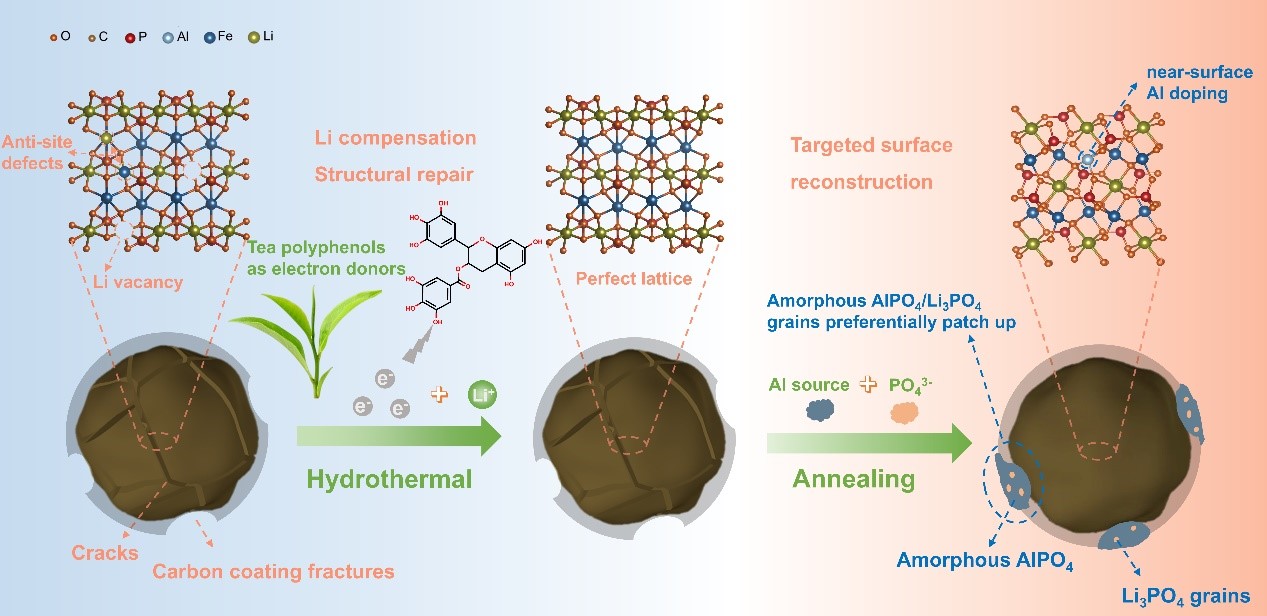 In this study, the researchers used naturally extracted tea polyphenols as electron donors. Through the synergistic effect of hydroxyl electron donors and supplemental lithium salts, they successfully converted the degraded FePO₄ phase back to LiFePO₄ and reduced harmful Li–Fe anti-site defects, fully restoring the composition and structure of the material and reconstructing rapid Li⁺ diffusion channels.