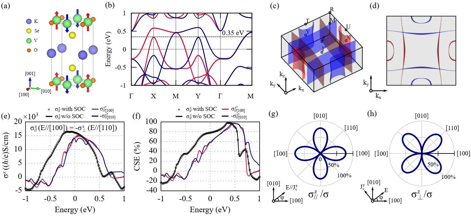 Inspired by the model analysis, the researchers performed theoretical calculations on the room-temperature d-wave altermagnet KV₂O₂Se. The results revealed the presence of a flat Fermi surface with nearly negligible dispersion along the kz direction. Moreover, two perpendicular sets of Fermi surfaces are occupied by opposite spin panels. This aligns remarkably well with the scenario uncovered in the theoretical modeling and indicates the potential for an exceptionally large CSE.