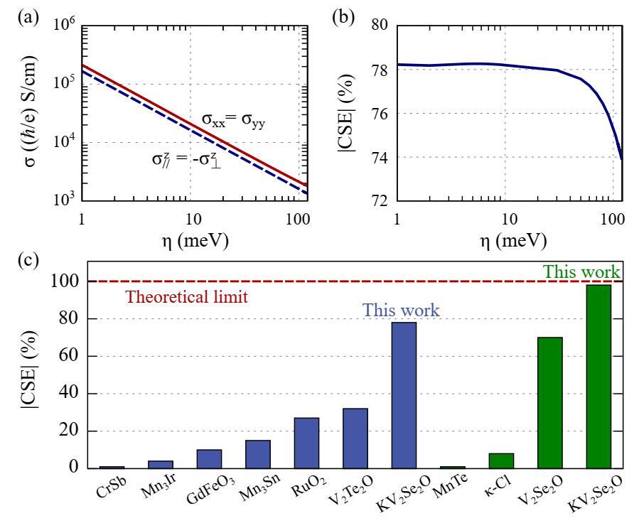A comprehensive comparison with reported T-odd spin current materials reveals that KV₂O₂Se stands out as a promising candidate for future applications. The CSE of KV₂O₂Se at the charge neutrality point is significantly higher than that of other alterneferents, surpassing even the prominent material RuO₂ by a factor of two, setting a new record for T-odd CSE efficiency. Additionally, KV₂O₂Se's spin conductivity reaches 3.2×10⁴ (ħ/2e) (S/cm) in both the transverse and longitudinal directions; its current density surpasses that of most intrinsic magnetic materials.