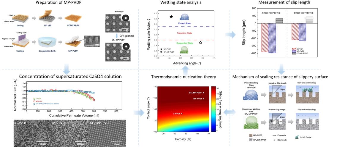 The latest result on the hydrodynamic behavior and scaling/fouling resistance of MD membranes was published in Desalination entitled "Understanding the fouling/scaling resistance of superhydrophobic/omniphobic membranes in membrane distillation."