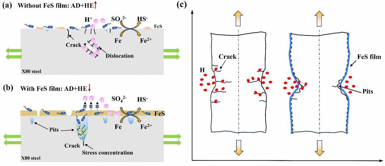 In this study, the researchers investigated X80 high-strength pipeline steel and found that SRB activity has a time-dependent dual effect. In the early stages, SRB significantly accelerate the initiation of stress corrosion cracking by promoting localized metal dissolution and by facilitating the generation and uptake of hydrogen into the steel, which embrittles the material.