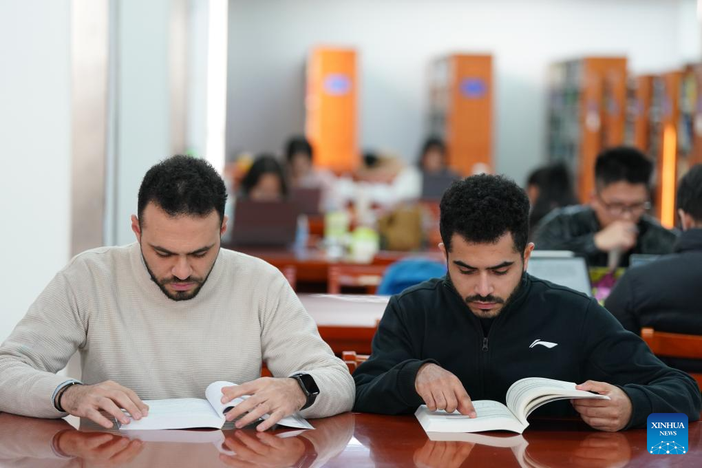 Ahmed Medhat Mostafa Elsayed (R) and his Egyptian classmate read at the library of University of Science and Technology of China in Hefei, east China's Anhui Province, Nov. 28, 2025. (Xinhua/Du Yu)