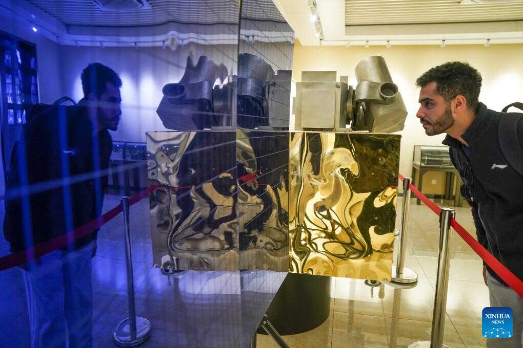 Ahmed Medhat Mostafa Elsayed looks at a model of a Quantum communication satellite at the history gallery of University of Science and Technology of China in Hefei, east China's Anhui Province, Nov. 28, 2025. (Xinhua/Du Yu)