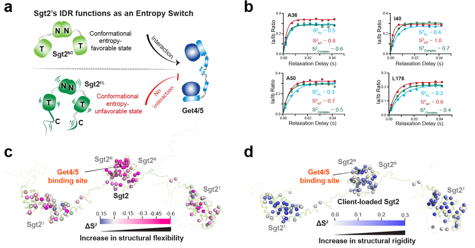 Fig. 2. Sgt2's IDR enables remote auto-inhibition and activation without direct contact by regulating molecular conformational entropy, thereby dynamically switching the protein's binding capacity. (Image by JI Tuo)