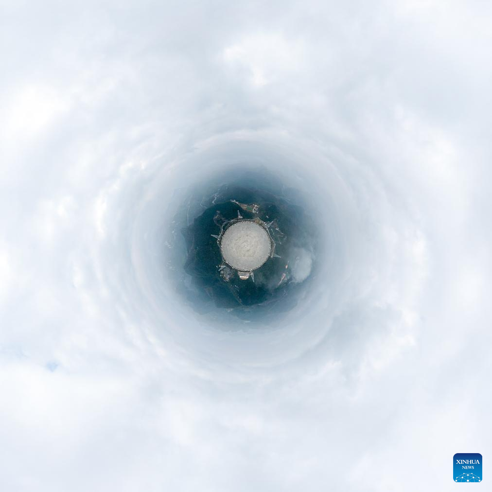 An aerial panoramic drone photo taken on Jan. 16, 2026 shows China's Five-hundred-meter Aperture Spherical Radio Telescope (FAST) under maintenance in southwest China's Guizhou Province. (Xinhua/Ou Dongqu)