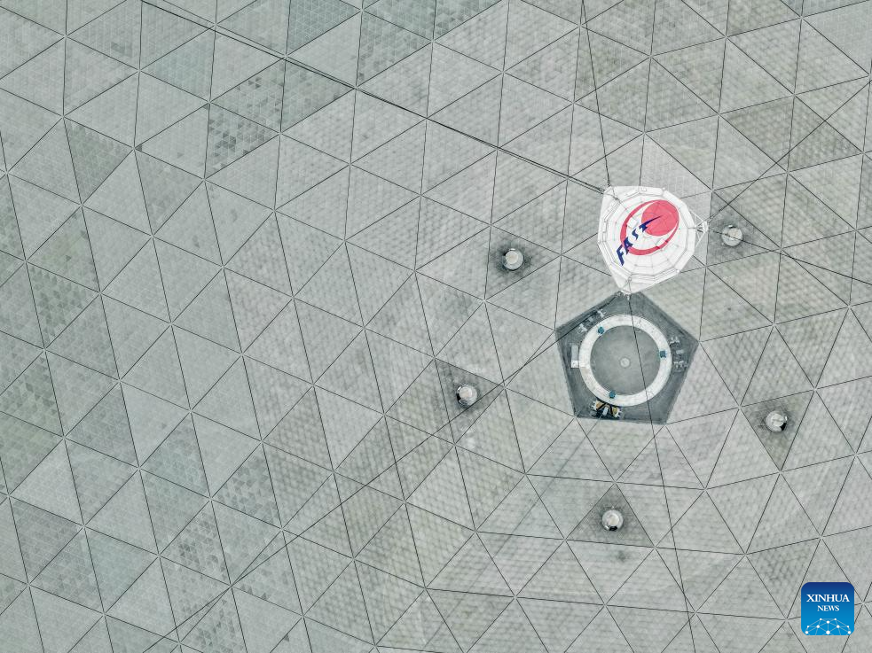 An aerial drone photo taken on Jan. 16, 2026 shows the feed cabin of China's Five-hundred-meter Aperture Spherical Radio Telescope (FAST) under maintenance in southwest China's Guizhou Province. (Xinhua/Ou Dongqu)