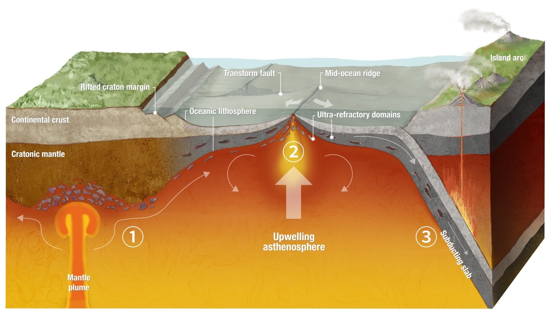 Moreover, these ancient rocks have strongly refractory compositions; in geochemistry, refractory denotes a lack of fusible (i.e., easily melted) components in the mantle. Therefore, they are less like oceanic materials, and more closely resemble rocks from the continents. The only possible explanation for this is that these Archean mantle rocks from the Indian Ocean had been dislodged and transported through the asthenosphere over 2,000 km to the mid-ocean ridge where they were discovered.