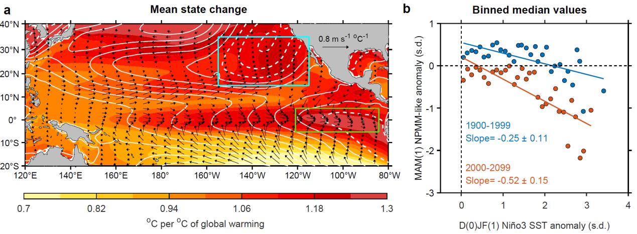 Fig. 2 The joint impact from the two mean-state warming maxima under greenhouse warming (a) is an NPMM-like pattern that is more sensitive to El Niño's warming anomalies and extends farther north (b) in the 21st century. (Image by IOCAS)