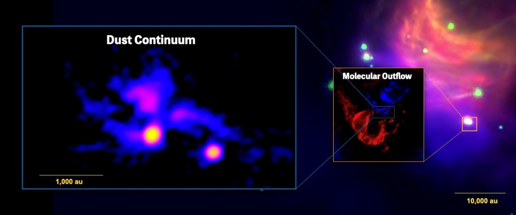 Recently, the international team ALMA Survey of Orion Planck Galactic Cold Clumps (ALMASOP) led by Prof. LIU Tie from Shanghai Astronomical Observatory (SHAO) of the Chinese Academy of Sciences conducted a high-resolution investigation on 72 dense cores in the Orion Giant Molecular Clouds (GMCs) with the Atacama Large Millimeter/submillimeter Array (ALMA), and discovered a forming quadruple-star system within one core. The result of ALMA observation also revealed ribbon-like dust structures and intricate molecular outflows.