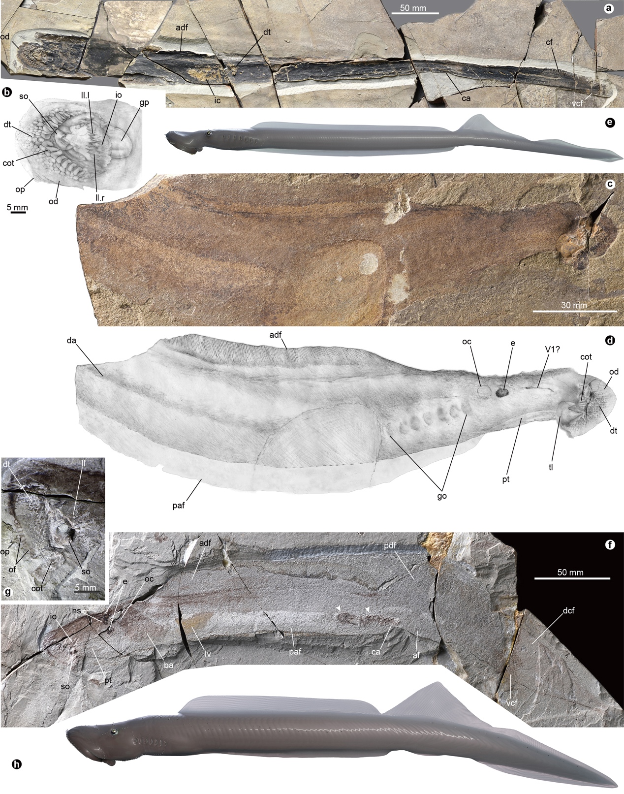 Fig. 2 Flesh-eating lampreys Yanliaomyzon from the Jurassic Yanliao Biota. a-e, Yanliaomyzon occisor; f-h, Yanliaomyzon ingensdentes (Image by NICE Vistudio and IVPP)