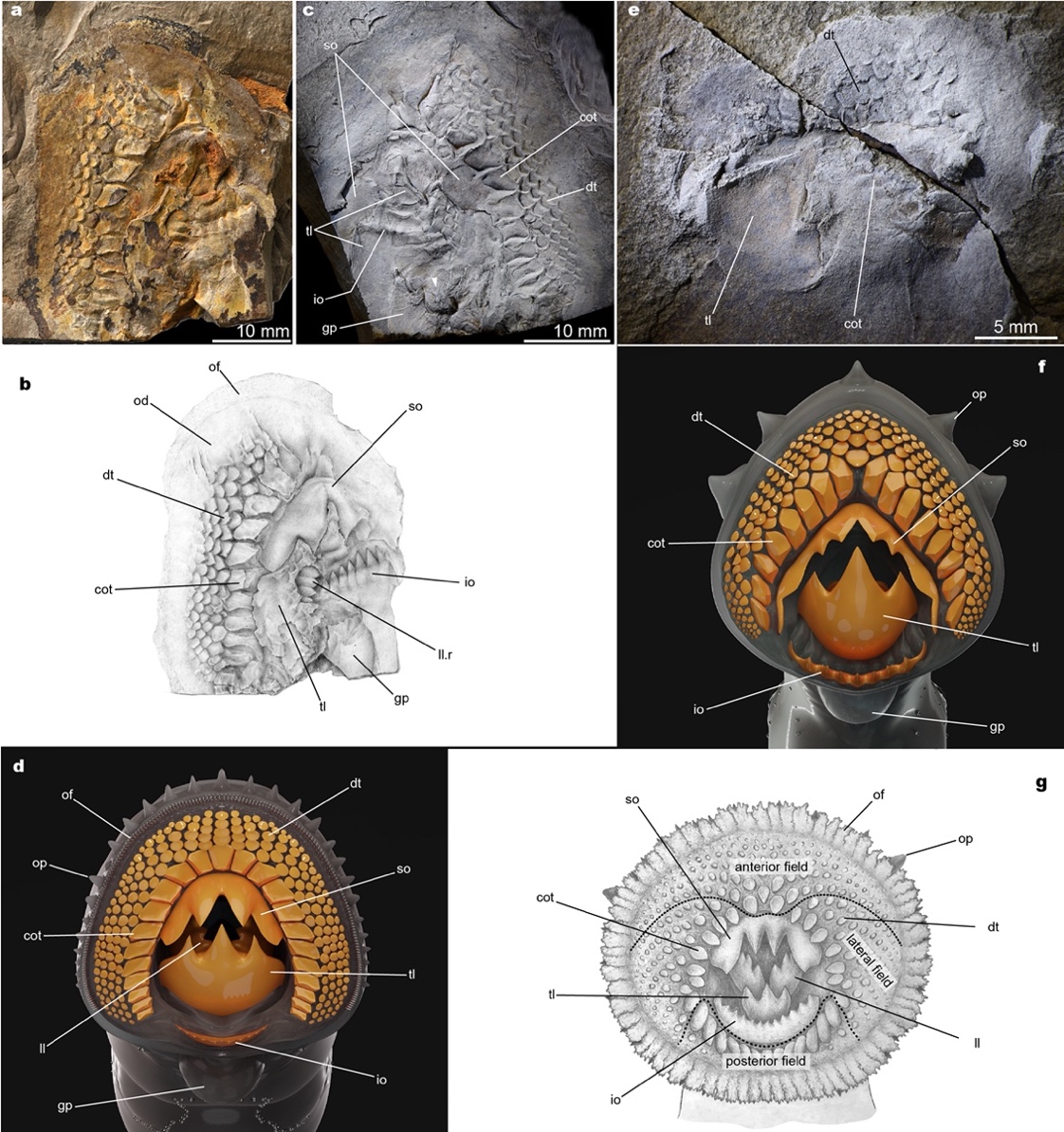 Fig. 3 The teeth of the Jurassic lampreys Yanliaomyzon (a-d, Yanliaomyzon ingensdentes, specific name meaning 'large teeth'; e, f, Yanliaomyzon occisor, specific name meaning 'killer') and those of the living pouched lamprey Geotria australis (g) now inhabits in Southern Hemisphere (Image by NICE Vistudio and IVPP)