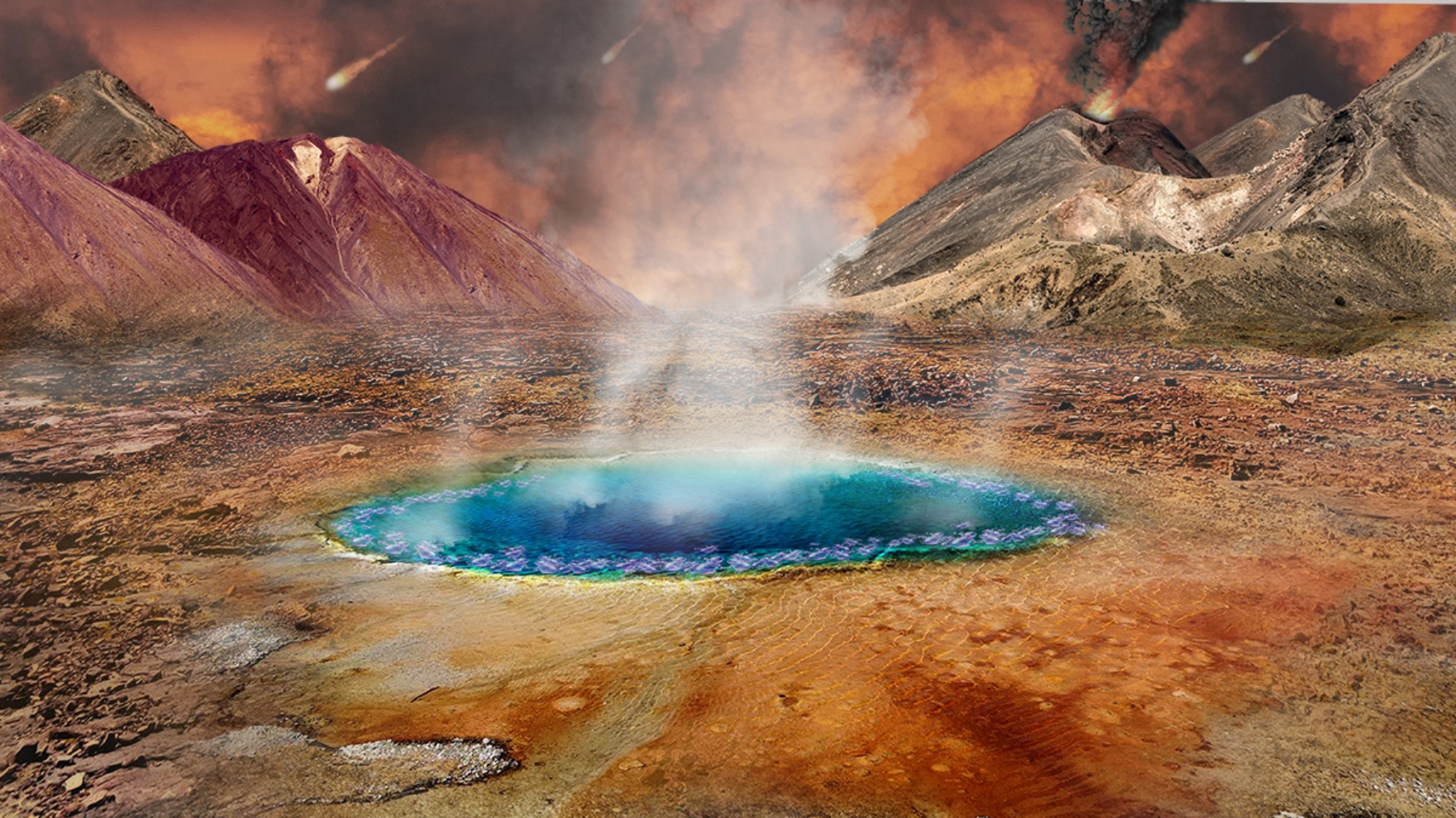 Figure 1: Conceptual illustration of terrestrial hot springs on early Earth (Illustration by Alex Bosoy, Design & Illustration, LLC)