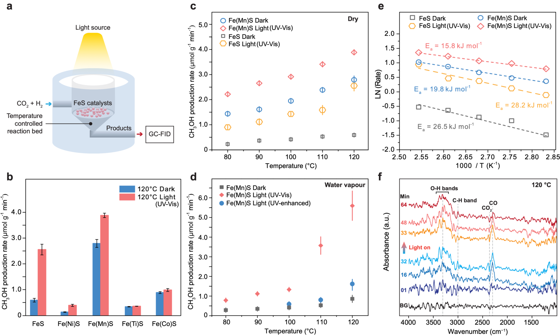 To further investigate the mechanism behind the H₂-driven CO₂ reduction, the team conducted in-situ analyses using diffuse reflectance infrared Fourier transform spectroscopy (DRIFTS). Results indicated that the reaction likely proceeds via the reverse water-gas shift (RWGS) pathway, in which CO₂ is first reduced to carbon monoxide (CO), which is subsequently hydrogenated to form methanol. Density functional theory (DFT) calculations provided additional insights, revealing that manganese doping not only lowered the reaction's activation energy but also introduced highly efficient electron transfer sites, thereby enhancing reaction efficiency (Figure 4). The redox characteristics of iron sulfides make them functionally analogous to modern metabolic enzymes, providing a chemical foundation for prebiotic carbon fixation.