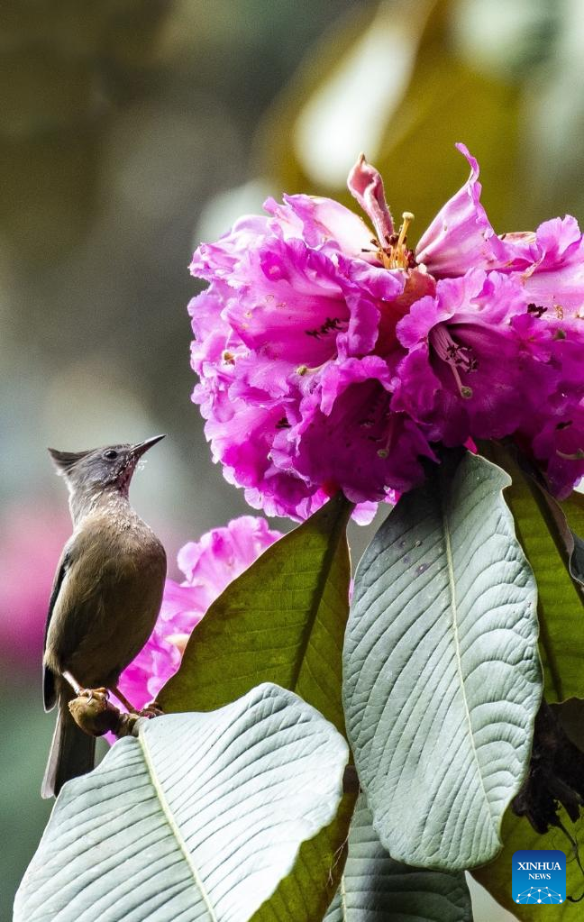 Photo taken on Feb. 26, 2022 shows the blossoming big tree rhododendron in the Gaoligong Mountains, southwest China's Yunnan Province. (Xinhua)
